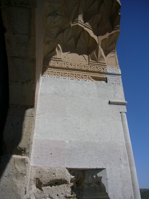 Behold the majesty of the crown door! The crown door of the covered section is situated in the middle of the southern side and projects from the main bearing wall. The crown door, with its very elaborate decorative program, carefully executed in a narrow area, presents a visual feast. The crown door complex is shaped around a pointed arch, surrounded with three borders. The outermost border is plain and the other two are decorated with different geometric elements. The edges of the borders of the second border were composed of regularly-spaced half square triangles followed by a row of half-star motifs. This motif can also be seen in the decorative program of other important buildings, such as the Ağzikara, Iğdir Ejder, and Aksaray Sultan Hans, as well as on the Divriği Site Melik Tomb. The border next to the half-star border is the widest one of the crown door, and is composed of geometric braids with eight-pointed polygons in the center. A composition composed of octagons surrounds the perimeter of the polygons. A double braid surrounds the perimeter with a double braid. This type of decoration is frequently seen in Seljuk buildings. The lower section of the crown door is a pointed arch. Two rosettes surrounded by spirals are set in the spandrels of the arch. The lower section of the arch contains five rows of muqarnas. The muqarnas hood of the Alay han is different than those of other Seljuk hans, which generally have 7 rows. The monumental scale and exquisite execution of the muqarnas cell hood here is impressive for such an early example. The vertical elements of the transverse flat arch rest on profiled lateral consoles, as is seen in the Ağzikara Han. The portal arch rests on lateral profiled consoles, which face to the interior of the door opening. The connection with the edges of the borders is provided in the corners by small pillars, which were reconstructed during the renovation. There is a line of naskh calligraphy and a damaged inscription above the row of muqarnas on the crown door. The placement of an inscription in this section is not a common treatment in Seljuk period buildings. There are additional differences: the han portal here differs from later portals, in that it does not have a cavetto (concave molding) frame, but rather a stepped recess with a patterned edge. It also differs because it does not have flanking niches. Rather, the Alay Han has a low-relief carving of a pair of affronted lions that share a single-forward looking head at the base of the muqarnas hood. The lions have two bodies but share a single head. They lean down inside a lotus flower on the inner face of the middle frame. The head faces forwards and the bodies, sitting on their hind legs, are drawn in profile. Their tails wrap over their backs. The origin of the sui generis single-headed, two bodied lion figure is not known. It was discovered during the restoration on the han carried out in 2008. This royal symbol is seen on the portals of the Cifte Medrese in Kayseri and in the Izzeddin Hospital in Sivas. The size of the lions is 0.45m x 0.23 m.